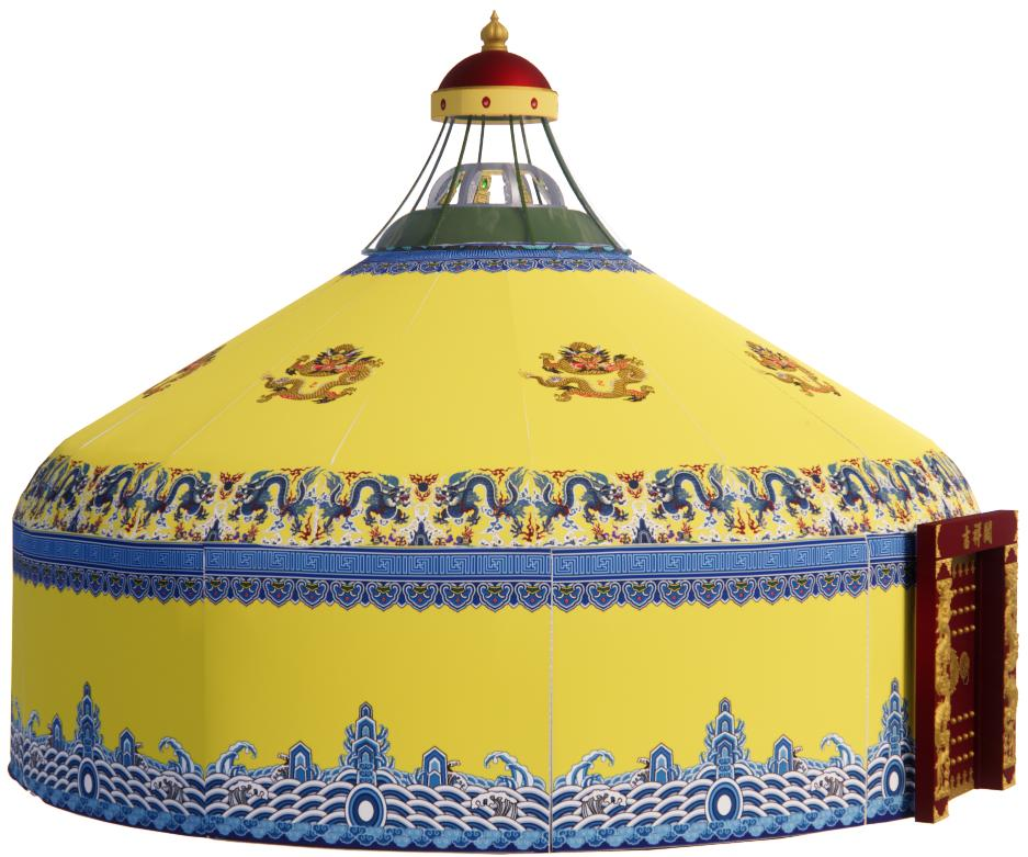 The rich yellow canopy, adorned with gilded totem patterns, exudes understated luxury—eye-catching enough to stand out as a premium focal point in any setting (resorts, private estates, event venues).